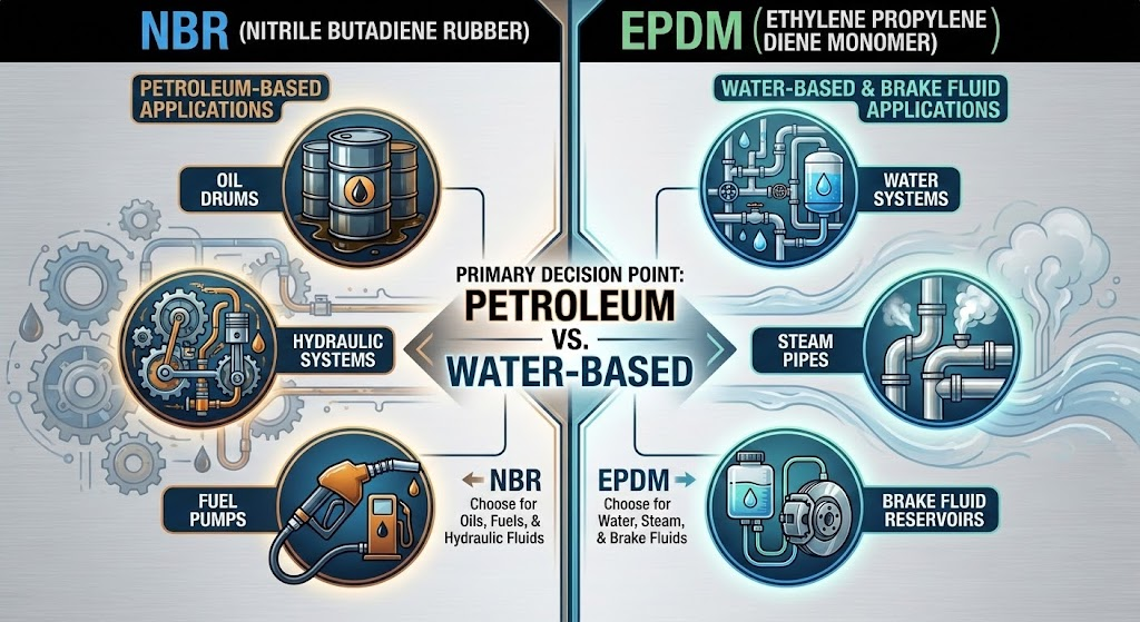 Choose NBR for petroleum-based media. Choose EPDM for water-based or glycol-based media. This rule eliminates most selection errors.